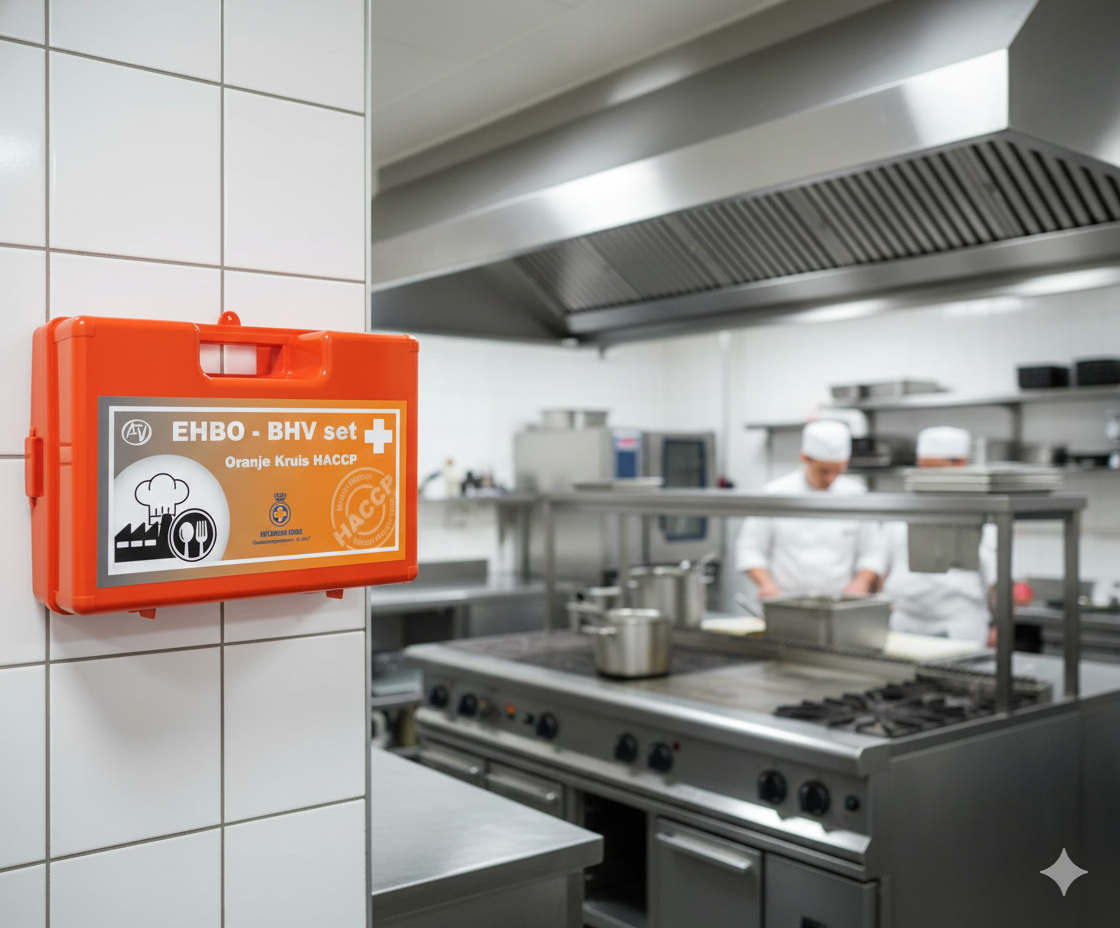 HACCP staat voor Hazard Analysis and Critical Control Points. Het is een systeem dat risico’s op voedselveiligheid beheerst. In de horeca betekent dit dat je maatregelen moet nemen om besmetting van voedsel te voorkomen. Ook je EHBO-koffer moet hieraan voldoen: pleisters, verbandmiddelen en handschoenen moeten bijvoorbeeld detecteerbaar zijn (vaak blauw van kleur) en hygiënisch verpakt. Zo voorkom je kruisbesmetting tijdens het behandelen van verwondingen in een keukenomgeving.