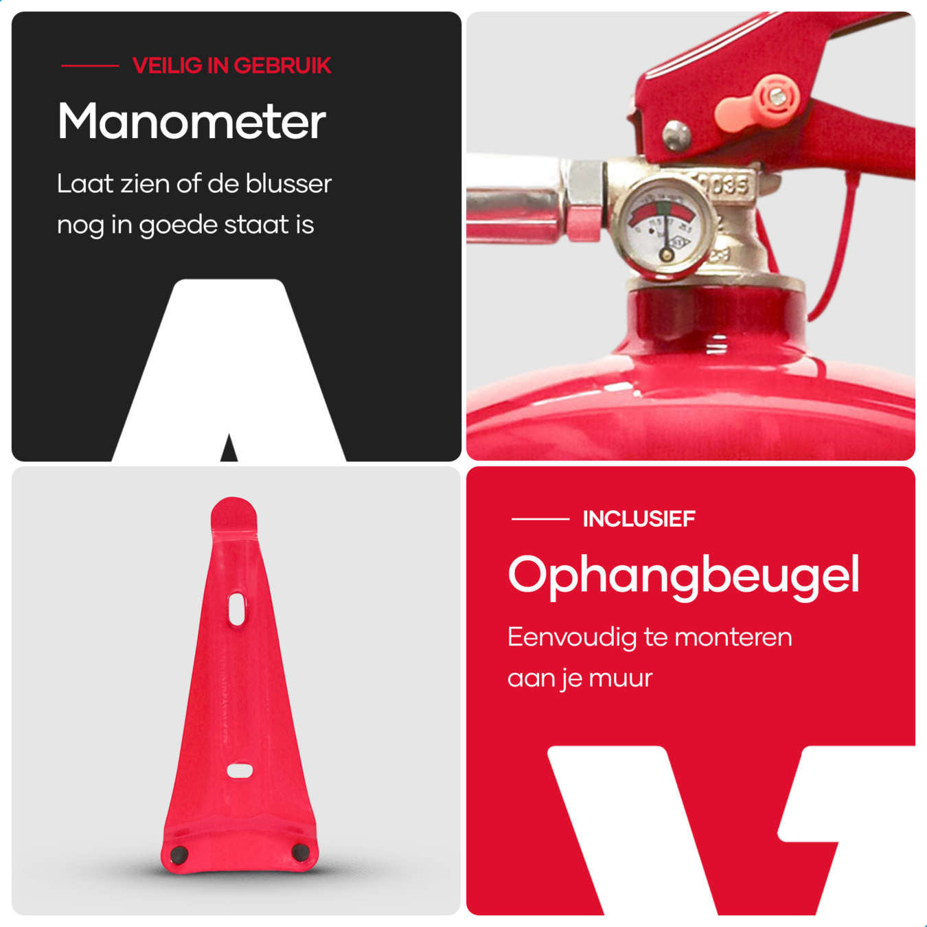 Met de handige montagebeugel hang je deze blusser zeer eenvoudig op. Deze blusser is te gebruiken binnen 2 brandklassen A en B (21A 144B). Met de manometer kan je altijd zien of de druk nog voldoende is. Je kunt deze blusser gebruiken van +5 tot +60 graden Celsius. Gekeurd voor de Nederlandse markt volgens Rijkstypekeur.
